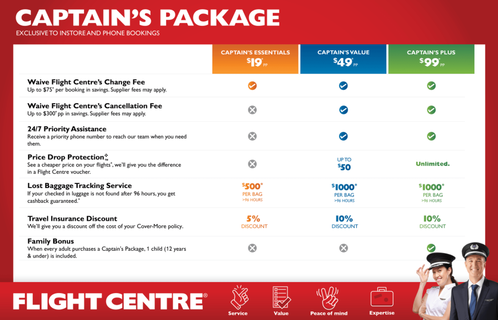 Captain’s Packages can be purchased in-store or over-the-phone (‘offline’) and with ‘online’ purchases of airfares: