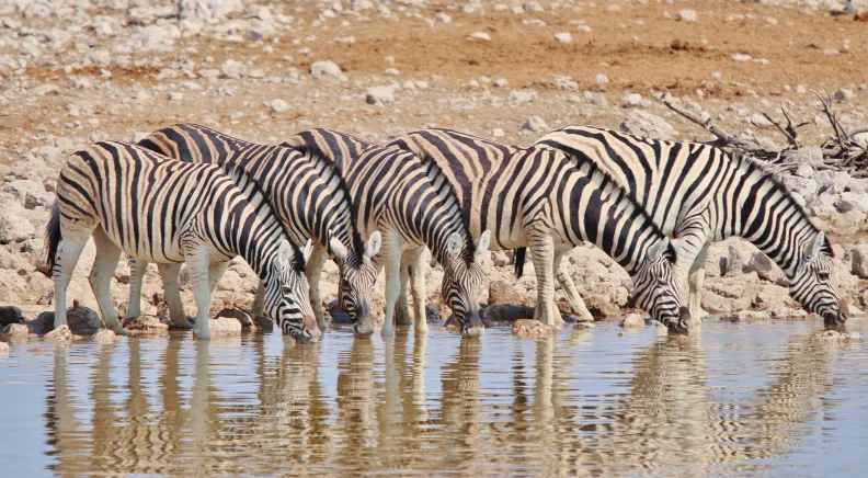 Leave Damaraland behind and head towards Etosha National Park. On arrival, the afternoon will be free to relax at your lodge. Maybe cool off in the pool, read a book, or enjoy a sundowner by the bar. Be sure to charge your camera tonight as tomorrow will be a full day in the park. This is one of the world's premier game-viewing destinations; spotting animals in the park is relatively easy due to the man-made waterholes and the large, sparsely vegetated pans. The bushland surrounding the pans is difficult to see through, but there are enough clearings, pans and waterholes to allow for sightings. Namibia has protected its game reserves against poaching, so there are large herds of elephants, antelope and other herbivores.