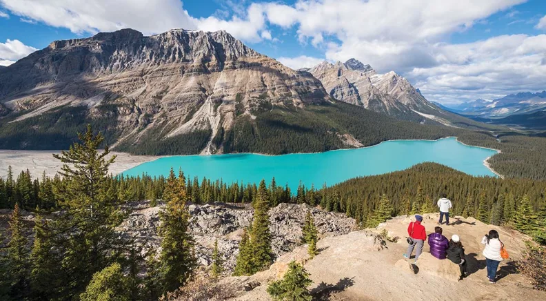 Welcome to the Canadian Rockies! Your adventure begins in Calgary with a welcome meeting at 7.30 am. You’ll meet your local leader and fellow travellers, and then it’s time to hit the road for Banff National Park. Your first hike of the trip will be at Tunnel Mountain. Take in your first experience walking among the Rockies’ unbeatable scenery. As the hike is relatively short, you’ll have some time this afternoon to explore Banff. Why not relax and unwind in the upper hot springs – at a height of 1524 m (5000 ft), these are Canada’s highest natural springs. There’s plenty to keep you entertained in Banff this evening. Maybe head to a local eatery to sample an elk burger or check out what’s on offer at the microbrewery – the views here are worth a toast!
