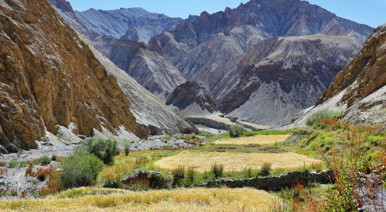 Today is another long trekking day, but on mostly flat trails. Walk through the scenic Markha Valley in the middle of the Hemis National Park and check out the old ruins that are on many hill tops here. These show the former importance of this ancient route and little is known about the origin of these ruins! Most likely, they are from the fortresses of Darden, who colonised the first sedentary inhabitants of Ladakh. If you’re lucky, you might see the wild blue sheep on the slopes here or an eagle circling in the sky. Just before the village of Markha, you’ll cross a stream to reach tonight’s campsite. Then, you can set up and settle in for the night.