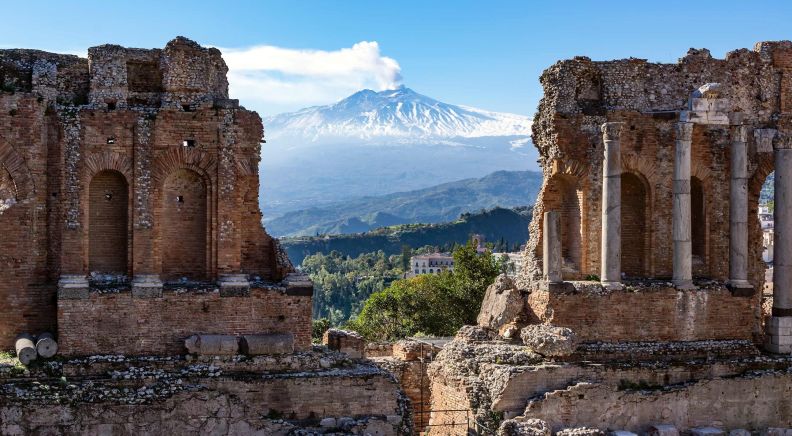 Taormina: Visit the ancient Greek Amphitheatre with your Local Specialist. Set on a cliff, open to the sky, take your seats and enjoy the view through the crumbling arches to Mount Etna.