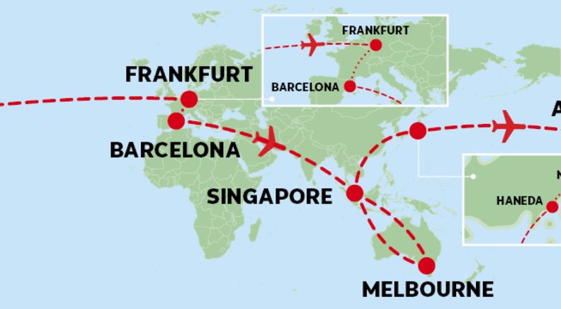 Round the World Economy Class airfare stopping in Singapore, Tokyo, Los Angeles, New York City, Frankfurt & Barcelona