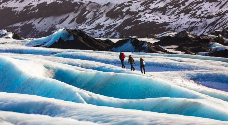 This morning, journey east to witness the massive Skogafoss Waterfall– one of the most dramatic sights in all of Iceland where you can often spot a rainbow (or two) in the spray. Stop at the Seljalandsfoss Waterfall, where you can walk behind the curtain of water for a different perspective (bring a raincoat!), then, swing by Dyrholaey to see rugged volcanic sea stacks and an endless stretch of black sand beach. Gear up for your glacier trek on Solheimajokull. After a safety briefing, you’ll strap on crampons, helmets and ice axes – then you’re off! After a short trek across rocky moraine left by the retreating glacier, you’ll step onto the ice and enter an otherworldly landscape of deep blue crevasses, ice caves and glacial waterfalls (known as moulins). Navigate around the ice while your expert guide explains glacial movement and the glacier’s formation, seeing firsthand the dramatic effects of climate change on a retreating glacier. After a big day, return to your cosy cabins in Hvolsvollur.