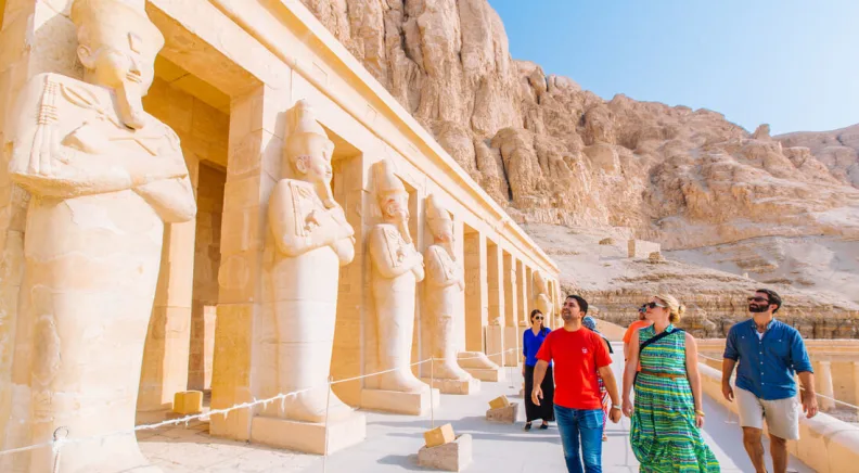 Today you’ll hop in a private minivan and discover ancient Thebes. Your first stop is the Colossi of Memnon – two 17-metre-high statues on Luxor's west bank. Continue on to the Valley of the Kings. Buried under the arid hills here are over 60 tombs of pharaohs, many richly decorated with reliefs and paintings. With your leader, explore this place, where the pharaohs of the New Kingdom (16th to 11th century BC) were secretly interred for all eternity, and where discoveries are still being made. Your group leader will explain the history and legends of these remarkable people, and the significance of the many paintings and hieroglyphics, still well preserved in the deepest tombs. You will visit three of the royal tombs, including Tutankhamun’s tomb where Tutankhamun is buried, then continue to the Temple of Queen Hatshepsut – a colonnaded building set against high cliffs that create a spectacular natural amphitheatre. The afternoon is yours to explore – perhaps you'd like to shop in the market or visit the world's first Mummification Museum where you can discover the secrets of pharaonic preservation.