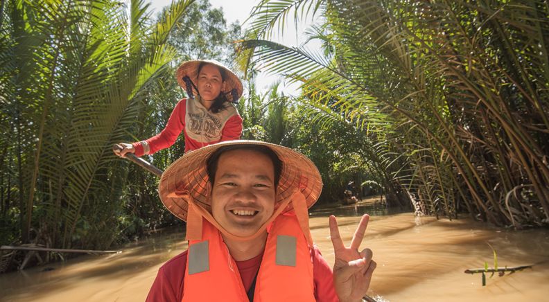 Today, you'll travel south to explore the Mekong Delta. When you arrive, board a boat and explore the intricate waterways. Often referred to as ‘the rice bowl’ of Vietnam, the fertile delta is where rice, tropical fruit and flowers are grown for the whole country. Disembark at Ben Tre and visit a local cottage industry to sample the candy that the region is famous for. You’ll have the opportunity to take a tuk-tuk around this remote village and stop to sample tropical fruit, see a honey farm and learn more about rural life. For lunch, go to a restaurant in the heart of the delta and try regional specialities such as the famous elephant-ear fish. After lunch, board sampans (small rowing boats) and paddle along the canals under the shade of lush water coconut trees. Stay overnight at a guesthouse on the river and swap stories with your hosts.