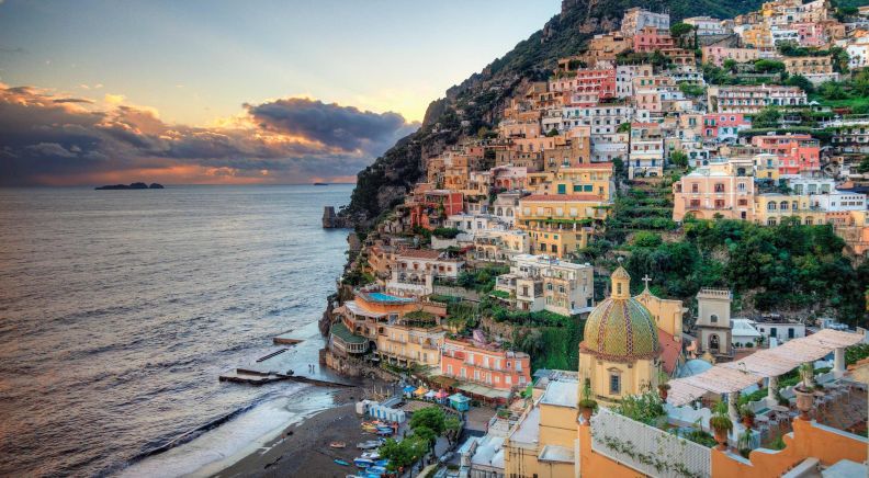 Positano: Drive along the Amalfi Coast to visit this seaside town. See the pastel rainbow of colourful houses precariously stacked upon one another as if cascading from the hilltop to the water.