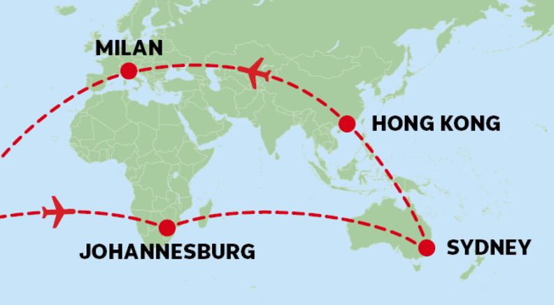 Round the World Economy Class airfare stopping in Hong Kong, Milan, Sao Paulo & Johannesburg