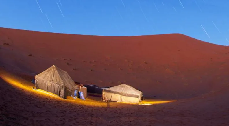 Midelt - Erg Chebbi. Today we embark on a scenic drive followed by an optional tasty Moroccan lunch (not included) and an afternoon relaxing and swimming. Then we head out to towards the Erg Chebbi dunes located near the remote frontier town of Merzouga. The dunes are renowned for their incredible height and size. In parts the vast sand pile reaches skyward to heights of 150 metres! Transferring to our camels we trek into the Sahara for a night at our Berber Camp. Tonight, we enjoy a local meal, music and an amazing night out under the Saharan stars.