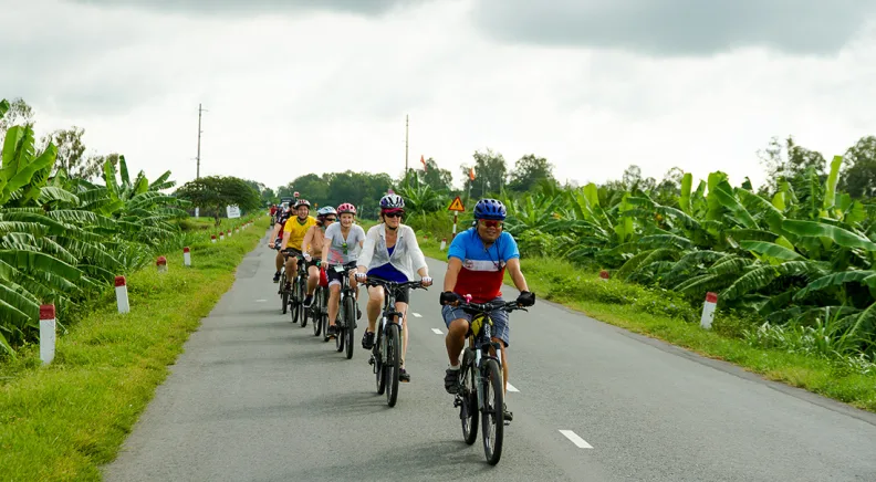 This morning you’ll hop on the bus and drive to the Mekong Delta – known as the ‘rice bowl of Vietnam.’ The fertile delta is famous for its harvest of tropical fruit, flowers and rice, as well as the waterside views over the canals. When you arrive, you’ll get on your bike for the first full day of cycling. Ride along quiet backroads, past farms and villages and make a stop for lunch. You’ll also get to visit orchards and some local cottage industries. Around sunset, make your way up one of the canals by boat to reach your homestay. Tonight, you’ll stay with a local family in their home and sit down for a homecooked dinner of local specialties.