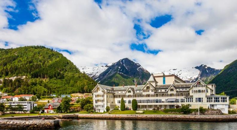 Bergen - Balestrand. Today we travel from Bergen to the beautiful village of Balestrand. Depending on the location of our hotel, we either take a short walk or a brief transfer to the port for our morning cruise. As we sail through the spectacular Sognefjord, known as the King of Fjords and the longest in Norway, we can sit back and enjoy views of steep mountains, cascading waterfalls, and small villages nestled along the shore. The cruise departs at 8 AM and arrives in Balestrand around midday, though times may vary slightly.