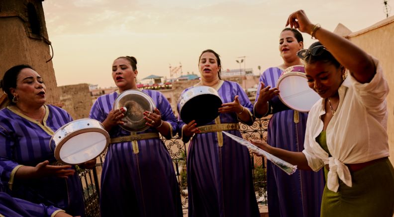Return to Marrakech, stopping at Ait Benhaddou along the way – the iconic mudbrick ksar. Retaining its thousand-year-old allure, the UNESCO World Heritage site is southern Moroccan architecture at its finest and has been used as a backdrop for many famous films (like Lawrence of Arabia and Gladiator). When you arrive in Marrakech, you’ll leave the hustle and bustle of the medina and visit the home of Zineb – a local woman who will be cooking your dinner tonight. Tuck into a beautiful traditional meal as you hear how Zineb’s hard work and determination to provide for her children has led her to where she is today. To cap off your final night together, The Houariyates – a female music band that takes its inspiration from the original tribes of I'Houara and Hammadas – will perform for you. Their joyful songs praise and celebrate women and often speak of desire, sensuality and love.