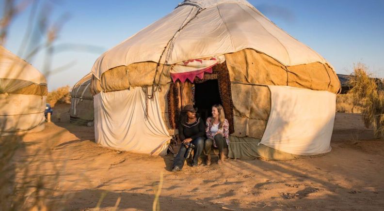 Depart Bukhara and drive to Gijduvan. Here you'll visit a ceramic workshop, where sixth-generation ceramicists Abdulla and Alisher Narzullaev make some truly beautiful pieces. Spend an hour or so at the workshop then continue to Nurata, a drive of approximately 2.5 hours. The city proper was founded by Alexander the Great in the 4th century BC, though archaelogical remains date the first inhabitants of the area many thousands of years earlier, and the ruins of his fortress can still be seen today. From Nurata, the group will head into the Kyzylkum desert to spend the night sleeping in yurts. Perhaps choose to take an optional camel ride in the desert, and enjoy an evening campfire and local music with tonight's dinner underneath the desert stars.