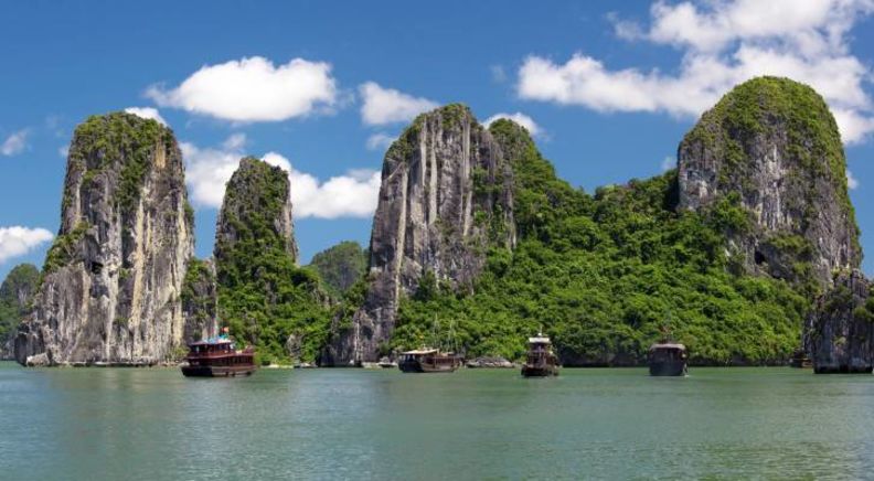 Hanoi – Halong Bay. This morning a scenic drive takes us to picturesque UNESCO Listed Halong Bay, where rugged karst islands dappled with lush vegetation rise from the pristine emerald coloured waters. Here we board a deluxe junk boat for an overnight cruise.