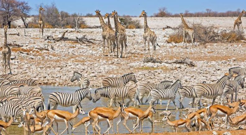 Damaraland - Etosha National Park. On day 6 we travel on to Etosha, Namibia's flagship national park where we enjoy our first game drive in the park, in our overland vehicle. Dominated by a giant salt pan, it is easy to the spot wildlife that gathers around the few watering holes to drink. Some of the species you may spot in the park include lion, leopard, cheetah, elephant, zebra and giraffe. Our lodge is located just outside the park entrance and this evening you can sit on your private patio and listen to the sounds of the bush. The following day we enjoy a full day game drive in open 4x4 vehicles from our lodge.